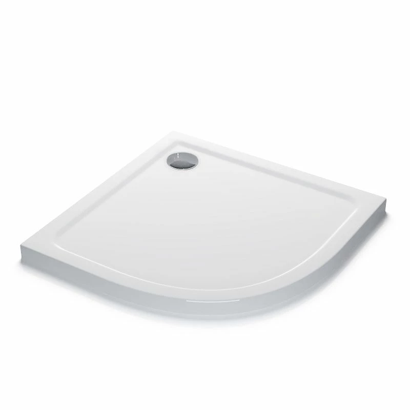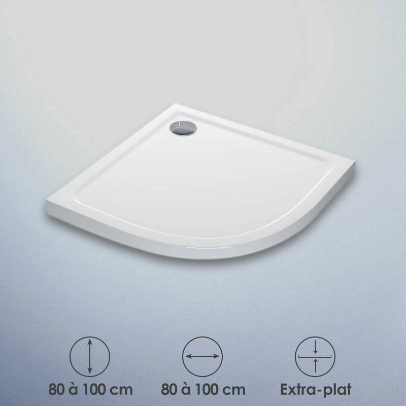 Receveur de douche quart de rond en acrylique renforcé, Bora. Diamètre de vidage 90mm. Disponible en 3 dimensions : 80×80 cm, 90×90 cm ou 100×100 cm. Hauteur 3,5 cm.