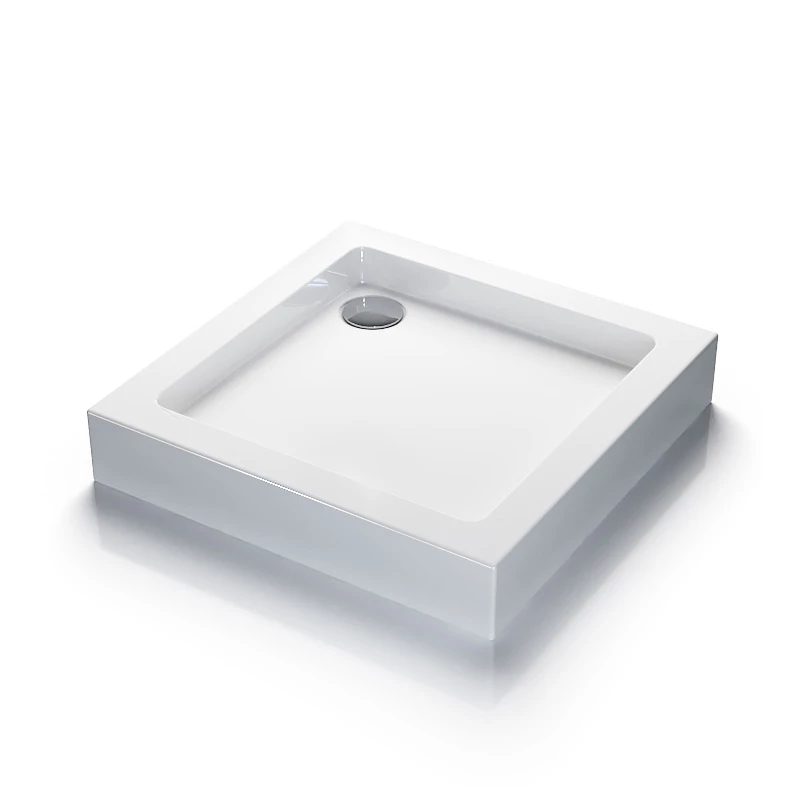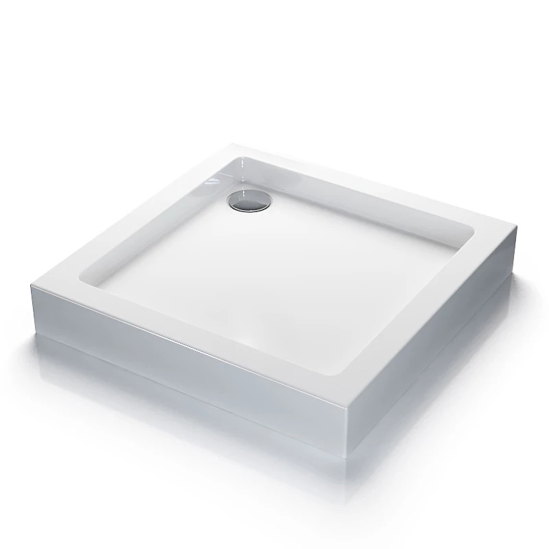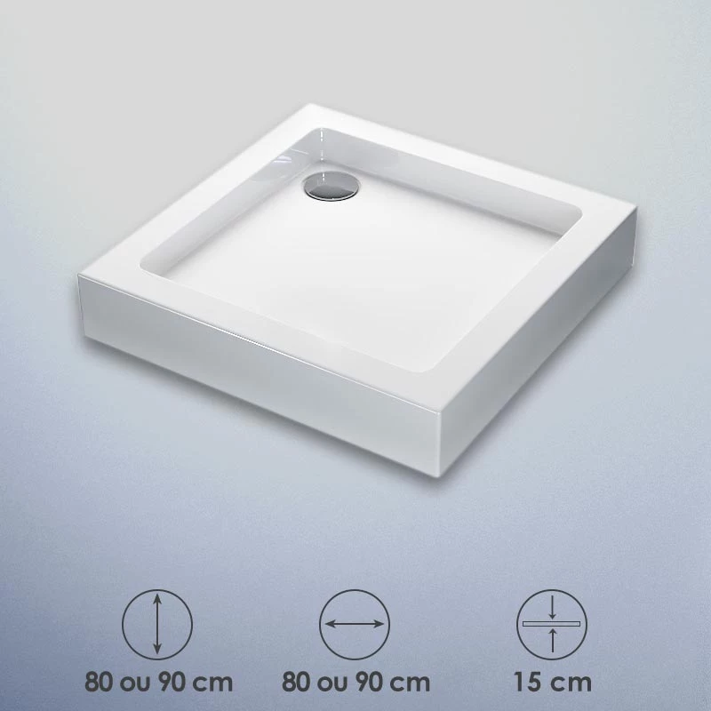 Receveur de douche carré et surélevé en acrylique blanc, Bora. Disponible en 80 X 80 X 15 cm ou 90 X 90 X 15 cm. Sa hauteur de 15 cm facilite son installation et permet l’intégration du siphon sans aucun travaux. Pour faciliter le passage des évacuations, l’arrière du receveur est ouvert. Par conséquent il ne peut être installé que dans l’orientation présentée sur l’image. Pieds réglables inclus, déjà fixés.
