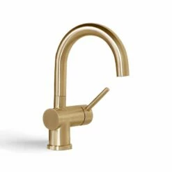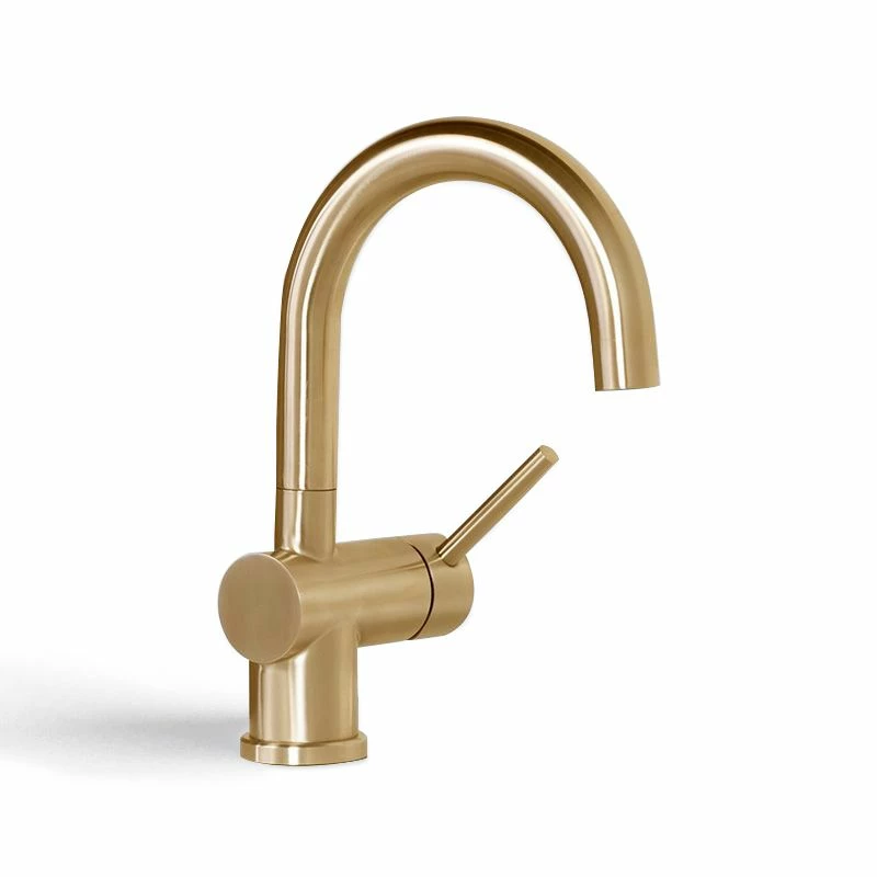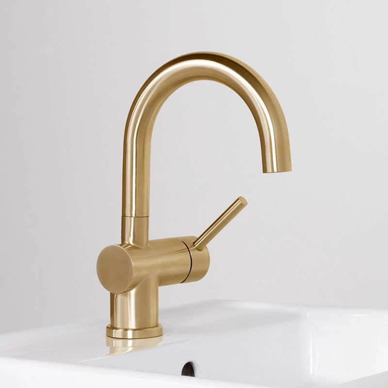 Le mitigeur de lavabo col de cygne Châtelet en acier inoxydable doré brossé allie finesse et élégance grâce à ses courbes. La finition dorée apporte par son aspect mat une touche de modernité supplémentaire à ce modèle de robinetterie. Le robinet Châtelet est fourni avec une cartouche céramique. Le bec de ce robinet pivote à 360°. Garantie 5 ans. Disponible en plusieurs coloris.