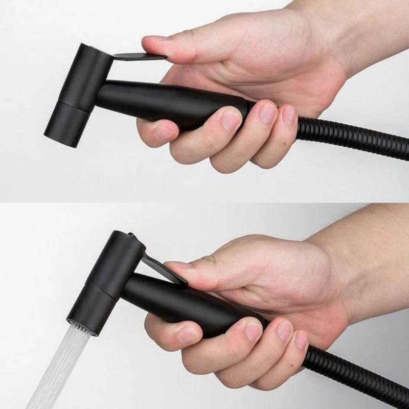 La douchette hygiénique en acier inoxydable noir mat s’actionne à l’aide de sa poignée ergonomique. Utilisation avec eau froide uniquement. Support encastré, robinet d’arrêt et flexible inclus avec la douchette.