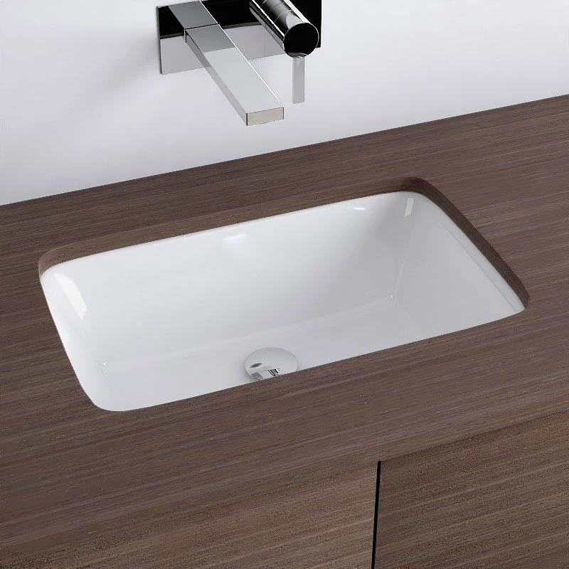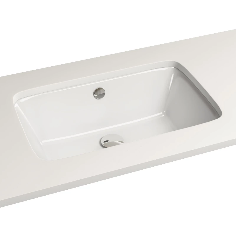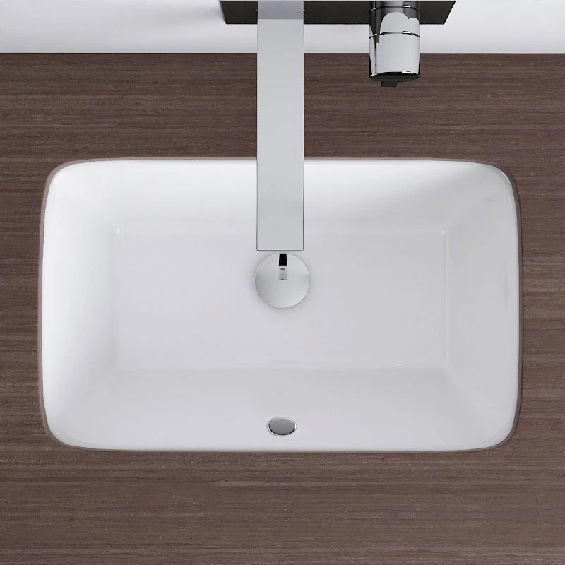 Vasque rectangulaire à encastrer par dessous en céramique blanche de qualité. Très esthétique, elle apportera un style très moderne à votre salle de bains. Elle doit être insérée dans un plan ou un meuble. Avec trop-plein couvercle chromé, à compléter avec une bonde clic-clac.