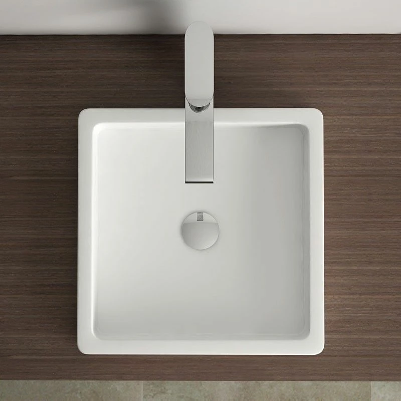 Vasque carrée en céramique, à encastrer par le dessus. Sans trop-plein. Garantie 2 ans. Nous vous recommandons de ne pas percer le plan avant d’avoir la vasque, une légère variation des dimensions peut avoir lieu d’un modèle à un autre (+/- 5mm).