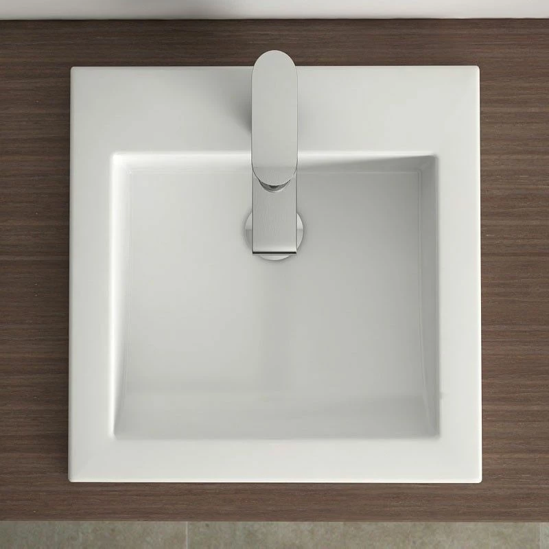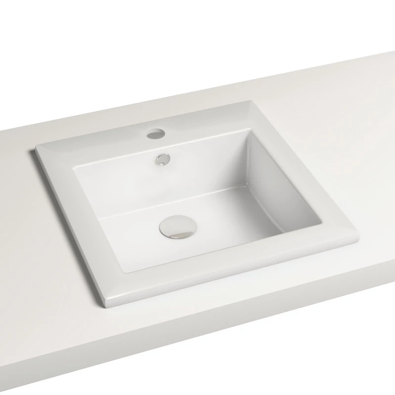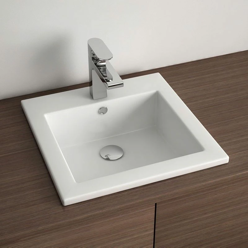 Vasque à encastrer par dessus en céramique blanche de qualité. Forme carrée très design avec plage de robinetterie. Avec trop-plein et cache chromé. Nous vous recommandons de ne pas percer le plan avant d’avoir la vasque, une légère variation des dimensions peut avoir lieu d’un modèle à un autre (+/- 5mm).