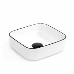 Vasque de salle de bain en céramique, carrée, Blanc brillant avec liseré noir, Fil. La collection céramique de Desvres : le savoir-faire artisanal d’excellence. Design contemporain, minimaliste et élégant. Matériau résistant, durable et imperméable. Facile à poser.