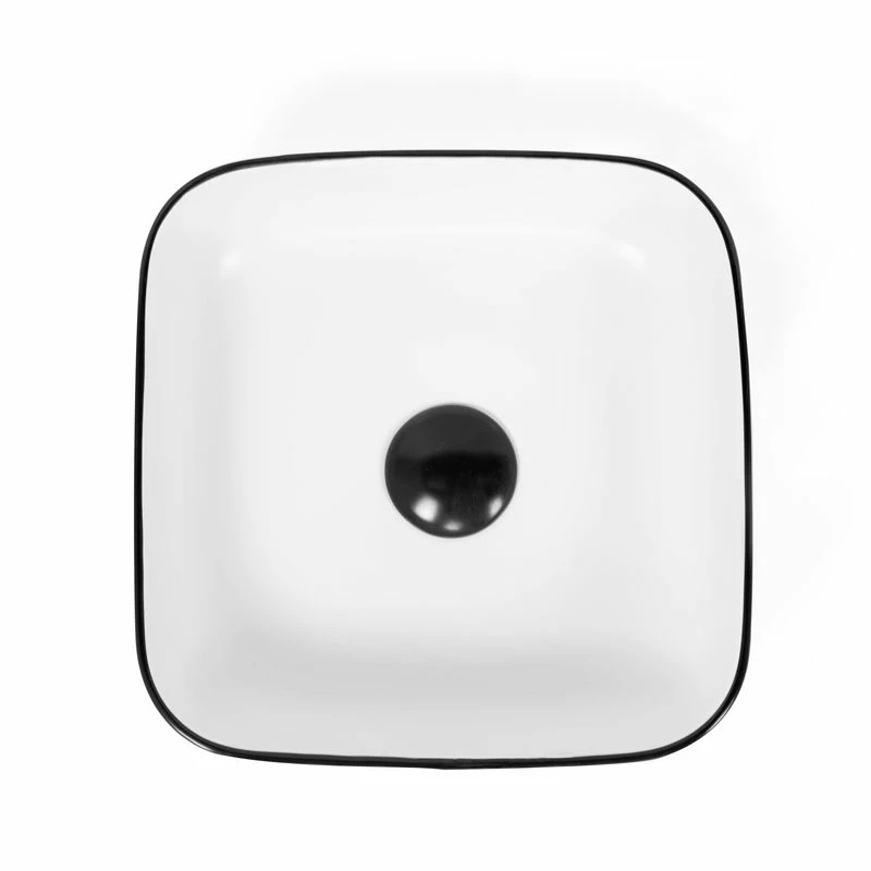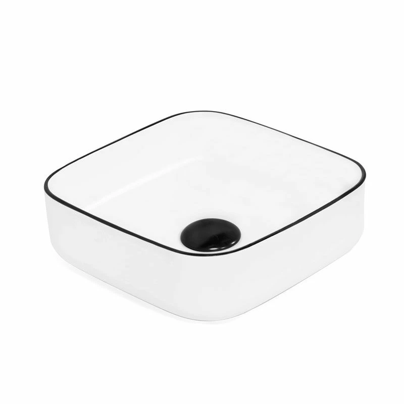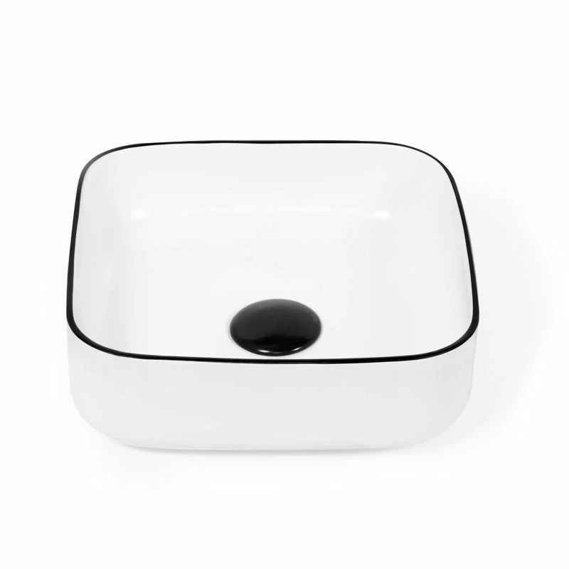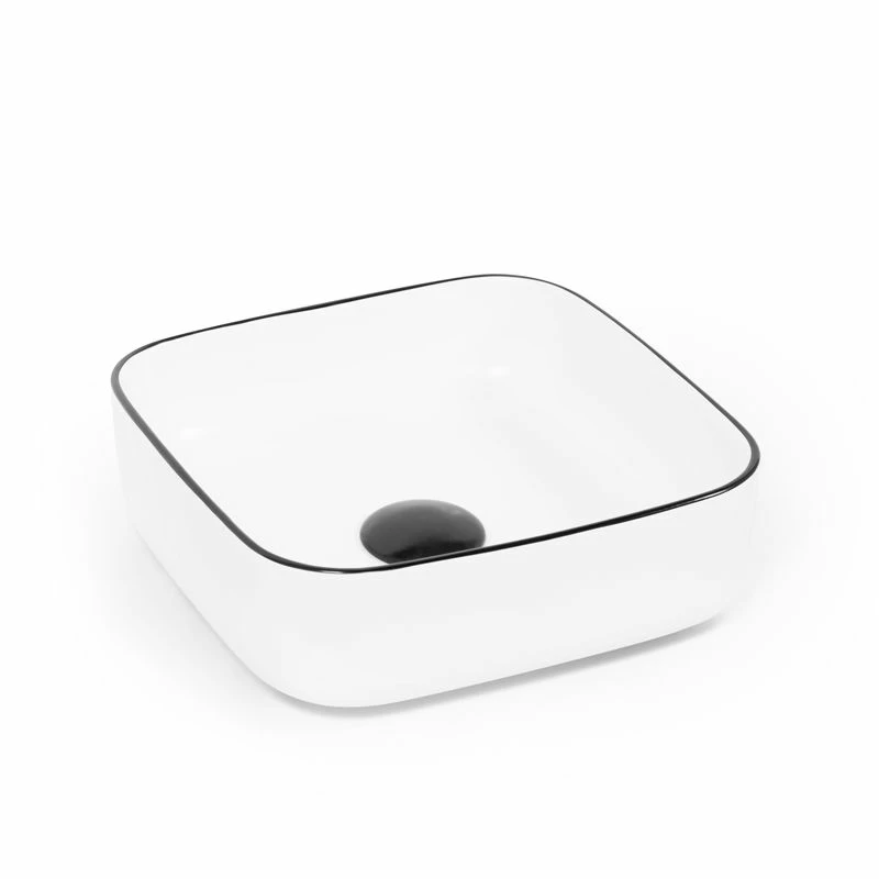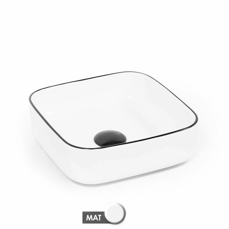 Vasque de salle de bain en céramique, carrée, Blanc mat avec liseré noir, Fil. La collection céramique de Desvres : le savoir-faire artisanal d’excellence. Design contemporain, minimaliste et élégant. Matériau résistant, durable et imperméable. Facile à poser.