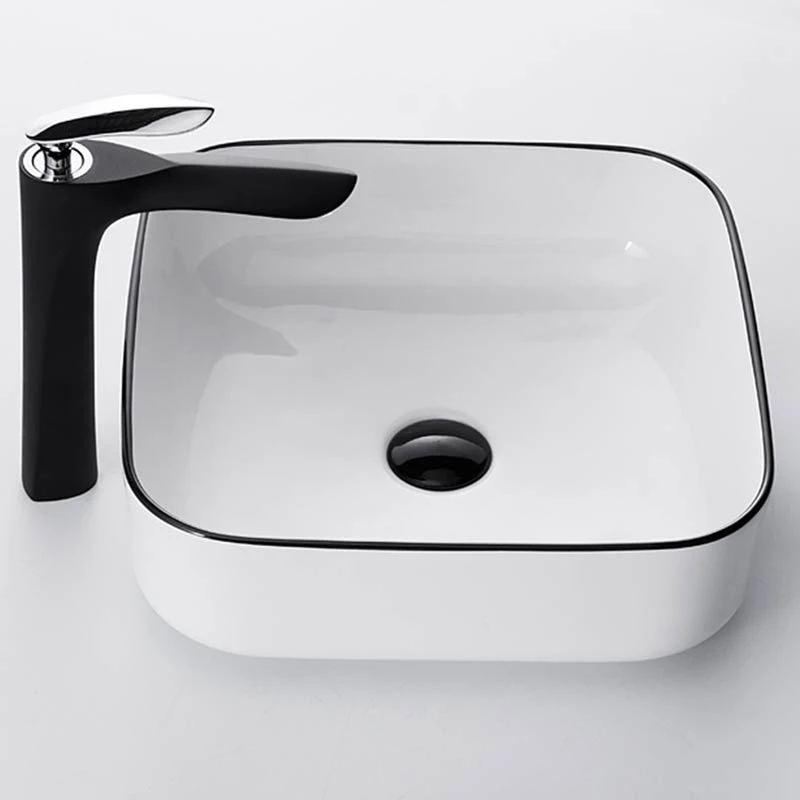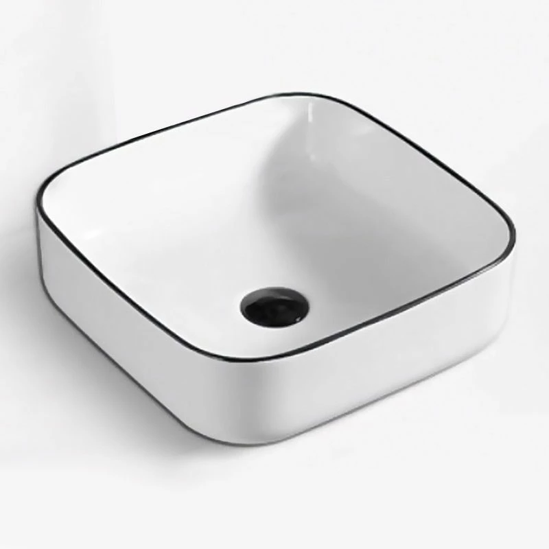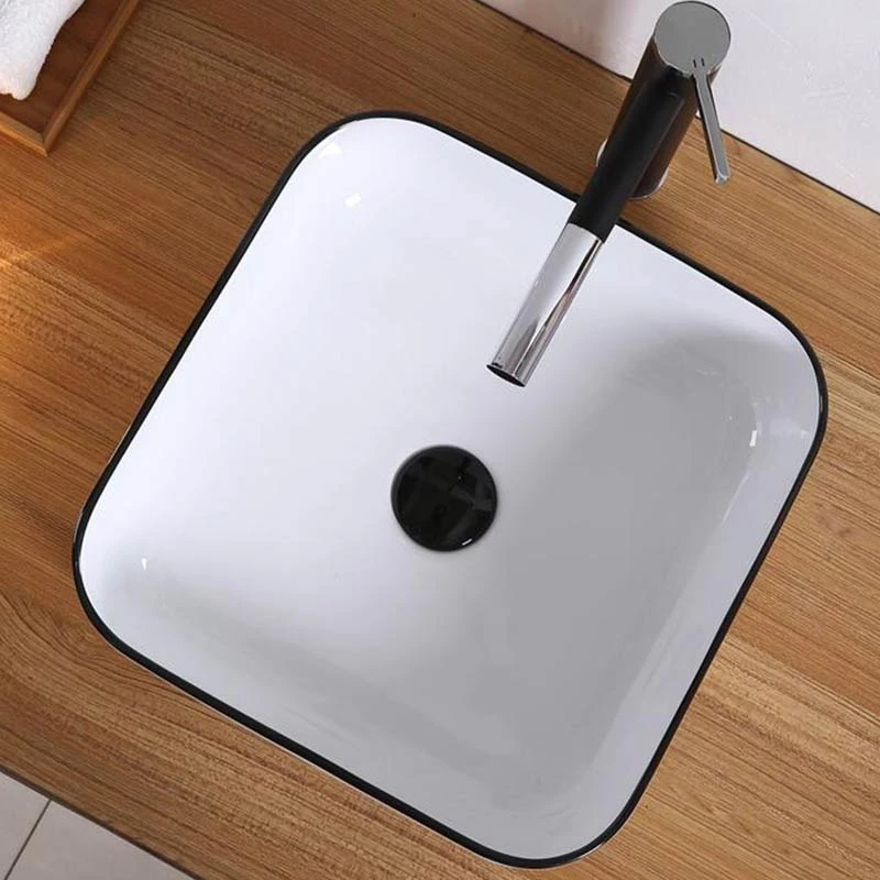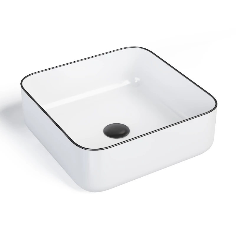 Vasque en céramique carrée à poser, blanc et liseré noir, Chic. Réalisée en céramique de qualité, cette vasque à poser apportera une touche très raffinée dans n’importe quel style de salle de bains. Sans trop-plein, à compléter avec une bonde à clapet fixe. Dimensions : L39 x l39 x H14 cm.