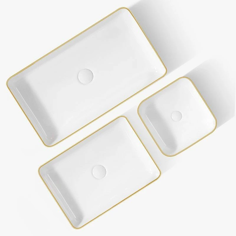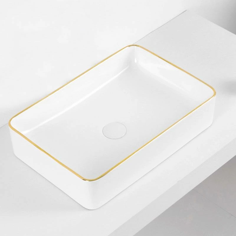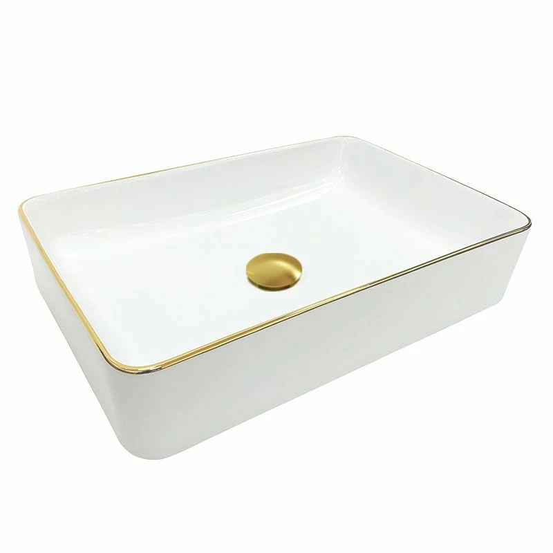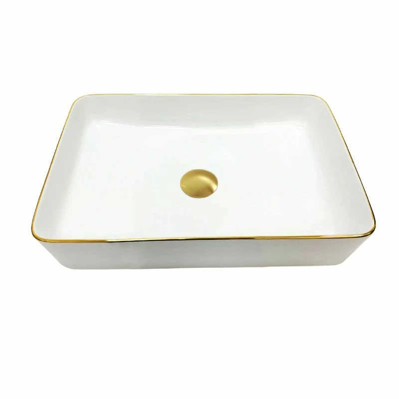 Vasque à poser blanche avec bordure dorée, Chic Gold. Réalisée en céramique de qualité, cette vasque bicolore à poser apportera une touche très raffinée dans n’importe quel style de salle de bains. Sans trop-plein, à compléter avec une bonde à clapet fixe. Dimensions : L50 x l34 x H11 cm.