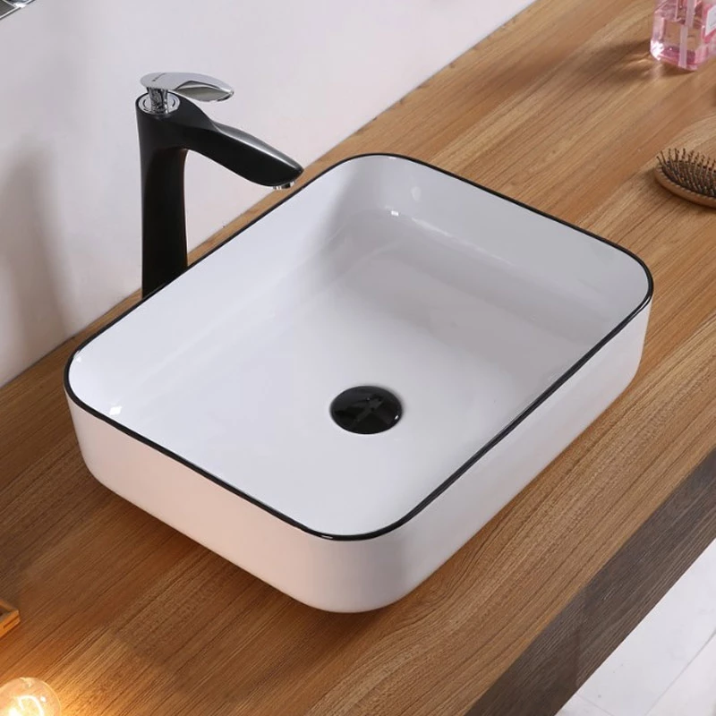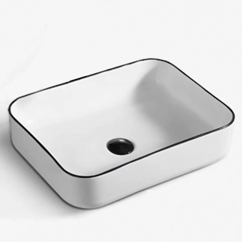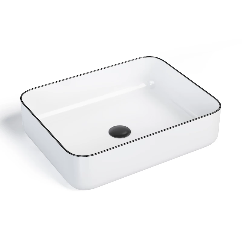 Vasque en céramique rectangulaire à poser, blanc et liseré noir, Chic. Réalisée en céramique de qualité, cette vasque à poser apportera une touche très raffinée dans n’importe quel style de salle de bains. Sans trop-plein, à compléter avec une bonde à clapet fixe. Dimensions : L51 x l40x H13,5 cm.