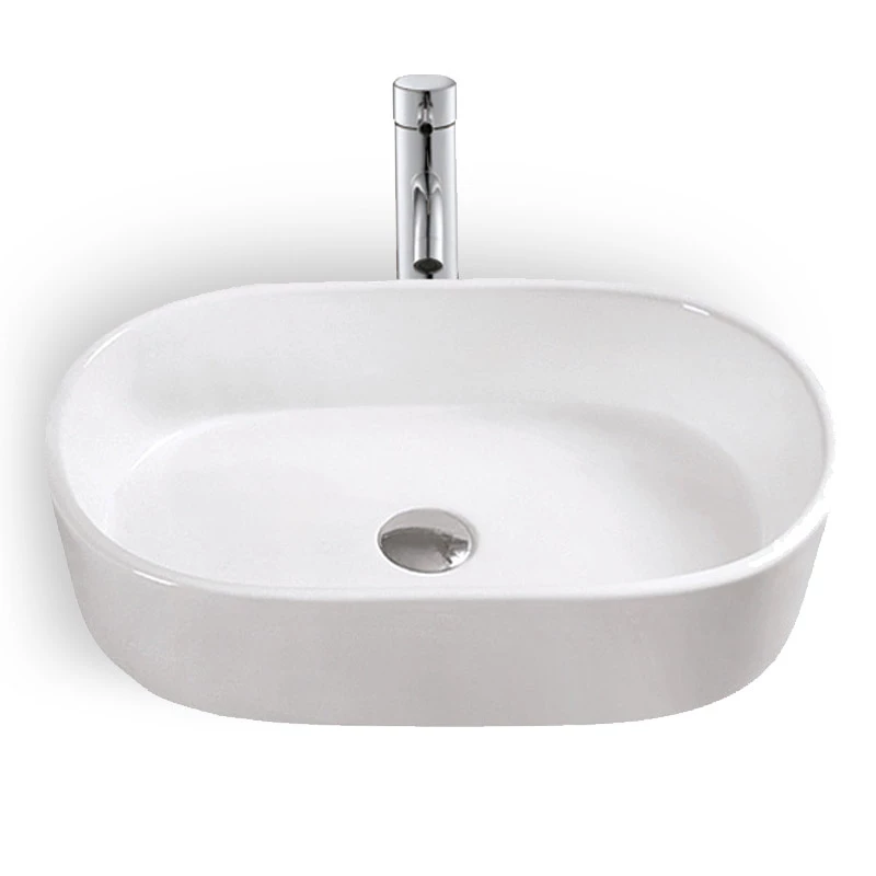 Vasque à poser ovale en céramique blanche, Art. Cette vasque minimaliste avec ses dimensions généreuses et sa bordure fine sera parfaite dans une salle de bains au style contemporain. Sans trop-plein, à compléter avec une bonde à clapet fixe. Bonde et siphon à commander séparément. Dimensions : 56×36,5 cm. Hauteur : 14 cm