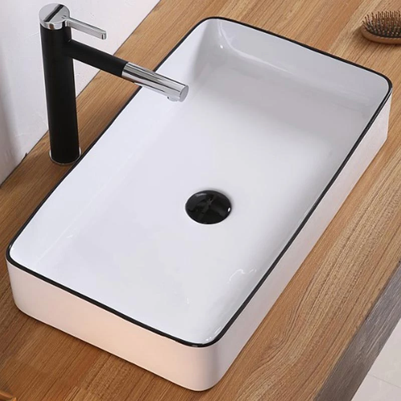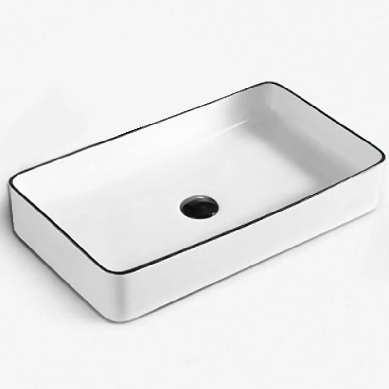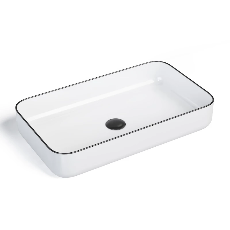 Vasque en céramique rectangulaire à poser, blanc et liseré noir, Chic. Réalisée en céramique de qualité, cette vasque à poser apportera une touche très raffinée dans n’importe quel style de salle de bains. Sans trop-plein, à compléter avec une bonde à clapet fixe. Dimensions : L60,5 x l35 x H11 cm.