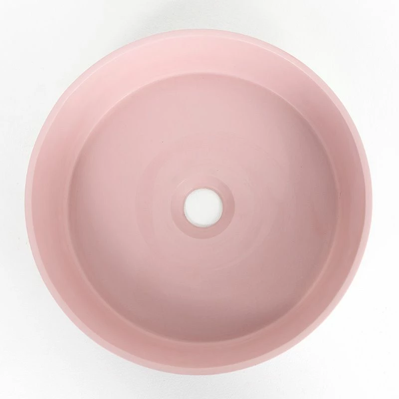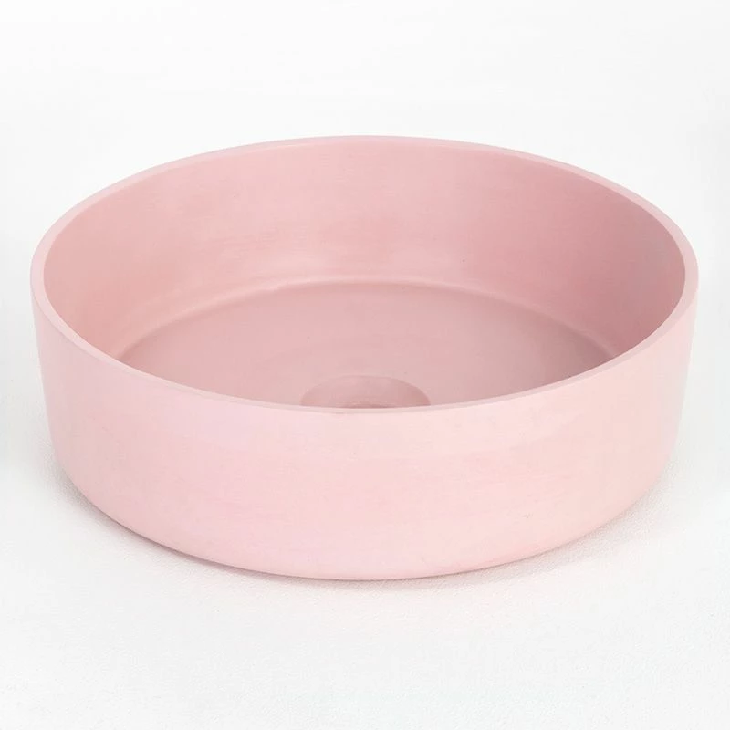 Vasque à poser en béton véritable, rose, Boya. Une vasque moderne et de qualité qui donnera une touche résoluement urbaine et colorée à votre intérieur. Traitement hydrofuge. Bonde à écoulement libre en option. Sans trop-plein. Dimensions : Ø36 cm. H. 12cm