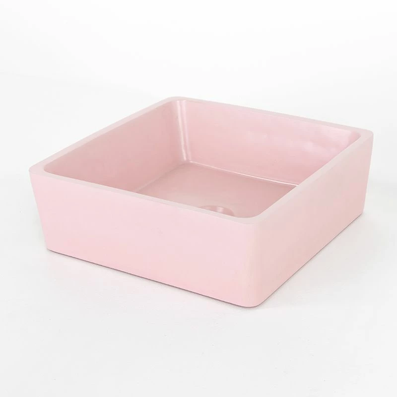 Vasque à poser en béton véritable, rose, Cube. Une vasque moderne de qualité qui apportera une touche urbaine et colorée à votre intérieur. Traitement hydrofuge. Bonde à écoulement libre en option. Sans trop-plein. Dimensions : l.38xP.38xH.14 cm.